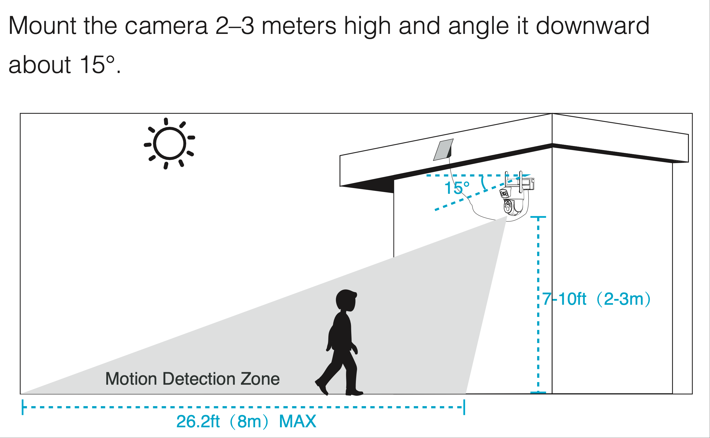 1. Mounting height: Install at 2–3 meters (7–10 ft).